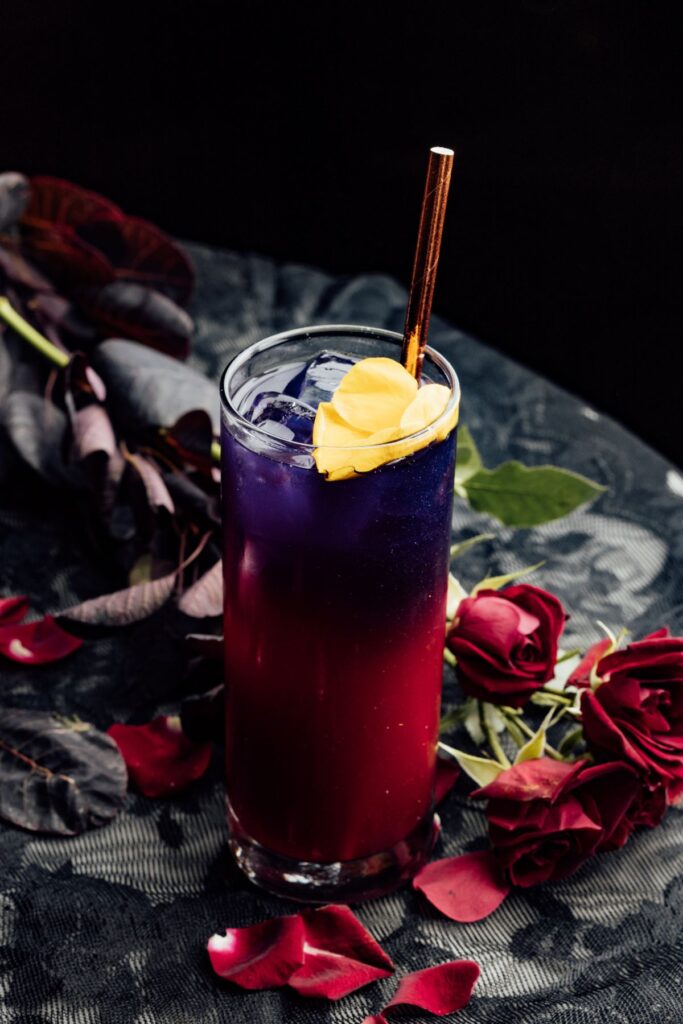 - Top with 1.5 oz. Butterfly pea flower-infused mezcal.