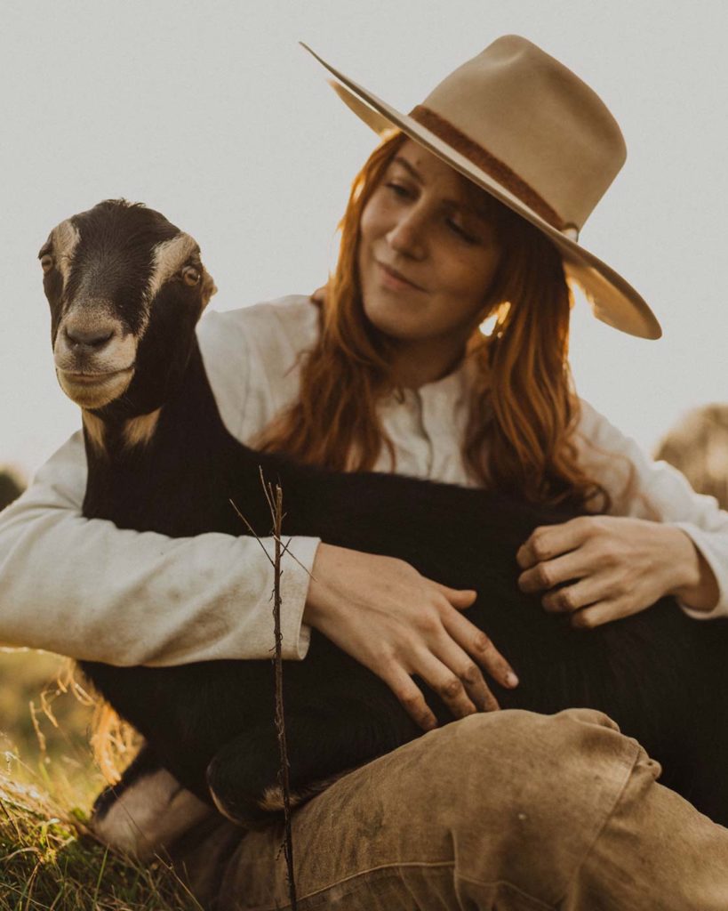 Kate Kavanaugh and her husband, Josh Curtiss, wake every day before sunrise. Kavanaugh slides into a pair of Curtiss’s worn hemp work pants, throws a wool-lined canvas jacket over her layers, and tops her long, russet locks with her favorite cowboy hat. The couple doesn’t even pause for coffee or breakfast before they step out of their old farmhouse into the milky light of dawn to begin feeding their small menagerie of farm animals: two horses, three cows, a motley and colorful brigade of goats, hens, geese and ducks. Early mornings on the farm are often cacophonous as the animals jostle to be the first ones fed. Big Boy, their huge, black steer, always angles in for a rub as they come near.